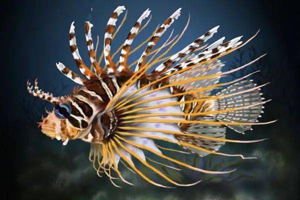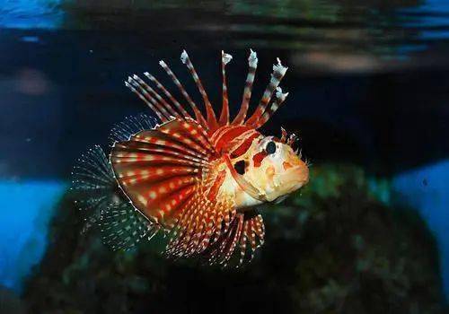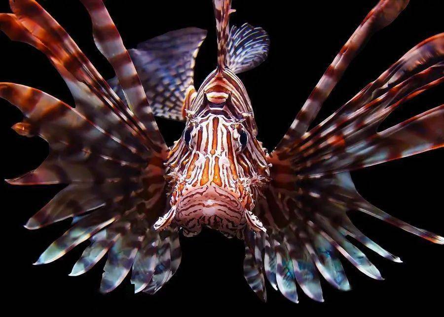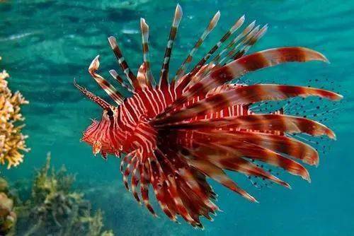 狮子鱼是世界上最美丽、奇特的鱼类之一。美丽的外表,红褐相间的条纹,使得它显得非常夺目,与海底色彩缤纷的珊瑚、海葵相映成趣。
