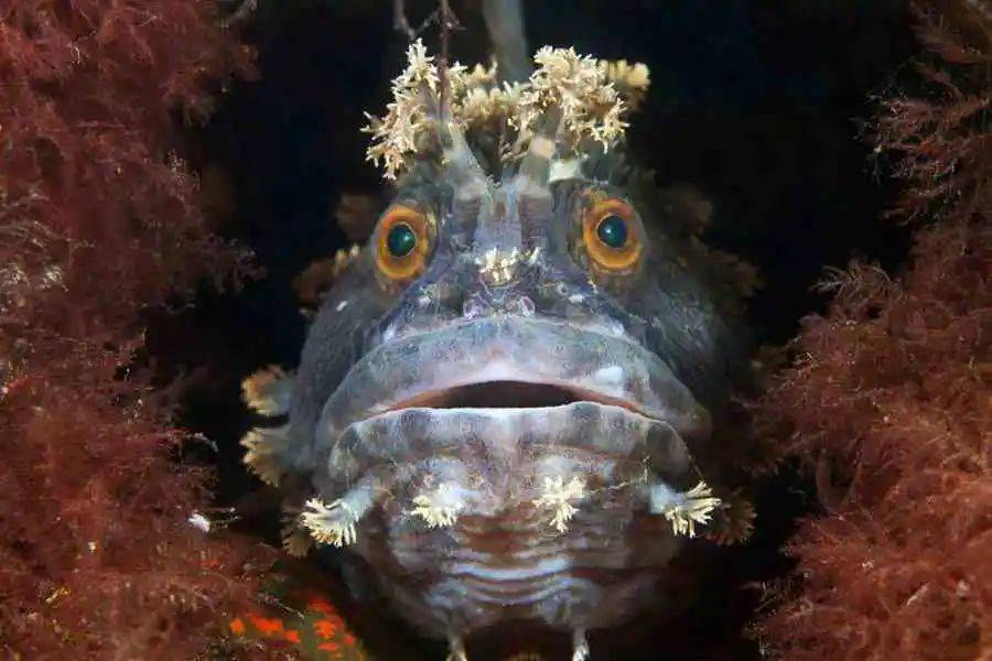 生活在海底的猴面鱼,体色为橙黄、橘红、浅棕色,腹部色浅,体侧有褐色云状横斑。头部有发达的繸状皮质突起,身体细长婀娜多姿,动作敏捷行动快速。大部分时间,它们都栖息在珊瑚礁岩石缝隙中。平时都喜欢躲在礁岩之间,仅露出头部观察环境。