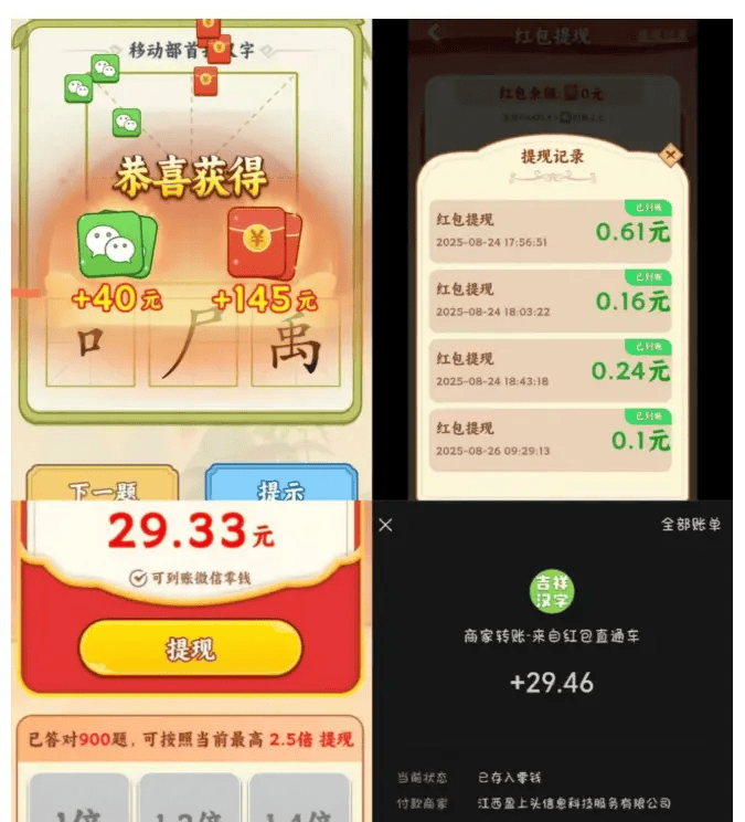 《吉祥汉字》将汉字拼写、添笔变字等玩法与红包激励结合,在休闲中涨知识、赢奖励。前期提现门槛较低,适合随时领取收益。