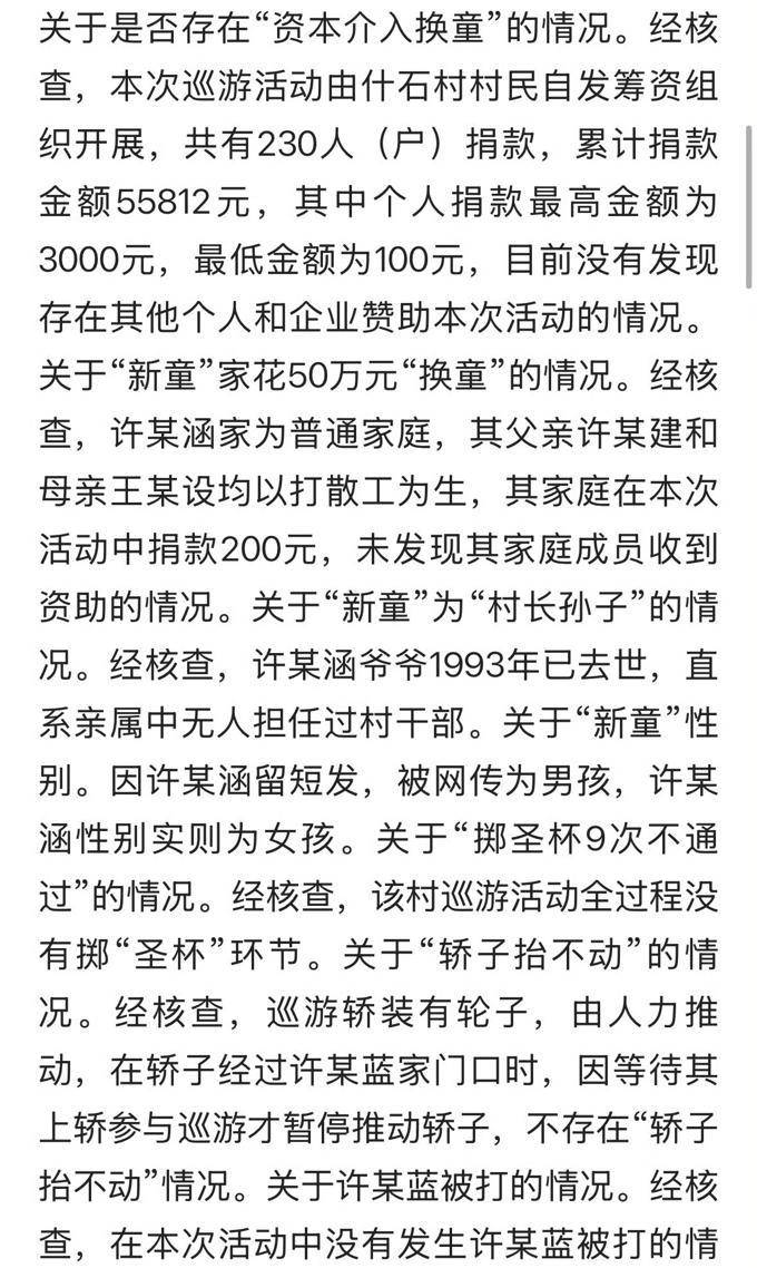 官方声明为:负责组织民俗活动的乡村居民曾多次走进家门进行邀请和劝导。在得到家人的同意之后,许某蓝最后登上了巡游轿子,并与许某涵共同完成了后续的巡游仪式,直到活动顺利完成。